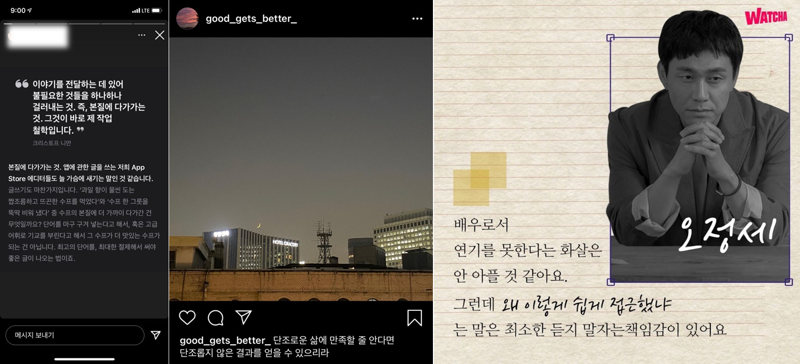 그래도 나이가 좀 들었다고 이런 시기가 오면 상황을 객관화하려고 든다. 소용은 없었다. 처음에는 오롯이 괴로워하고 지나가게 할지 벗어나려고 안간힘을 쓸지 생각했는데, 그건 점점 의미가 없어졌다. 그냥 힘들었다(ㅋㅋ). 조금 나아지는듯하다 또 난이도 높은 프로젝트에서 고전하다보니 어느새 10월이 되어 있었고 그즈음부터는 좁았던 시야가 조금씩 넓어졌다. 돌아보니 사진첩에서도 이겨내려고 업무관련 아티클도 읽고 일기도 썼고 오정세 배우의 한마디에 울림을 얻기도 했다.